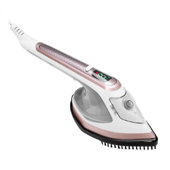 Informacje dodatkowe: 2 w 1 Parownica do ubrań & żelazko, Ekspresowy czas nagrzewania 20 sekund, Jedna temperatura dla wszystkich tkanin, Wyświetlacz LED, Nasadka ze szczotką, Prasowanie w pionie z ciągłym wyrzutem pary, Prasowanie na sucho, Automatyczne wyłączenie - funkcja strażak, Ceramiczna stopa: 14,3 x 9,7cm, Stopa ze szpiczastą końcówką ułatwiająca prasowanie dokoła guzików, Moc maksymalna 1800W
