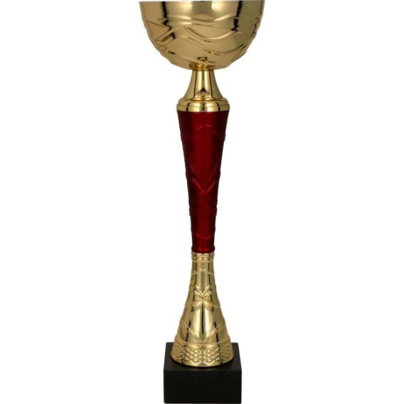 Klasyczny wzór pucharu utrzymany w kolorystyce złoto-czerwonej. Subtelności nadaje mu niewielki kielich z motywem fali oraz pięknie zdobiona wąska nóżka. Idealnie sprawdzi się jako trofeum wręczane podczas różnego rodzaju wydarzeń.
