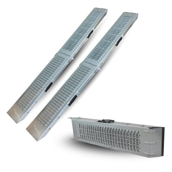 Zestaw dwóch stalowych ramp najazdowych o nośności 400 kg zapewnia wygodę i bezpieczeństwo podczas załadunku motocykli, kosiarek, skuterów oraz maszyn budowlanych.