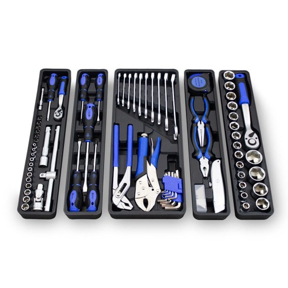 Narzędzia są poukładane i uporządkowane w pięciu tacach narzędziowych, układ jest przejrzysty i ułatwia komfort pracy.