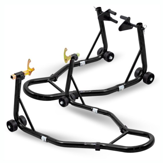 Zestaw stojaków motocyklowych na przednie i tylne koło to niezawodne narzędzie do serwisu, napraw i przechowywania motocykla. Umożliwia łatwe podnoszenie kół, zapewniając wygodny dostęp do elementów pojazdu i stabilność podczas pracy.