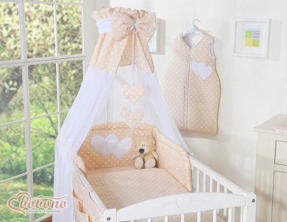 Baldachim z tiulu- Serduszka białe grochy na beżu