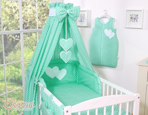 Baldachim z tkaniny- Serduszka białe grochy na mięcie