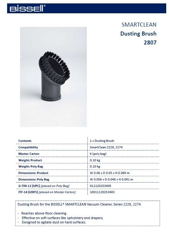 Opis ogólny: kolor - Black : Producer product family - Smartclean Dusting Brush Technical details: Pojemność - No Producer - Bissell Zawartość opakowania: Ilość na paczkę - 1