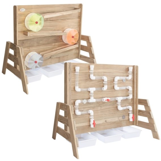 Drewniana Ściana "Zabawa Wodą" od renomowanej marki Classic World to idealne dopełnienie twojego placu zabaw. Produkt jest wyprodukowany z wysokiej jakości drewna, pomalowany nie toksycznym impregnatem, w pełni bezpiecznym dla dzieci. Należy nasypać piasek na drewnianą półkę i obserwować jak obsypuje się w dół, co będzie powodować obracanie się młynku. Z drugiej strony ścianki znajdują się tunele, do których można wlać wodę. Zabawa będzie pełnić funkcję nauki napędzania i wprowadzenia koła w ruch.