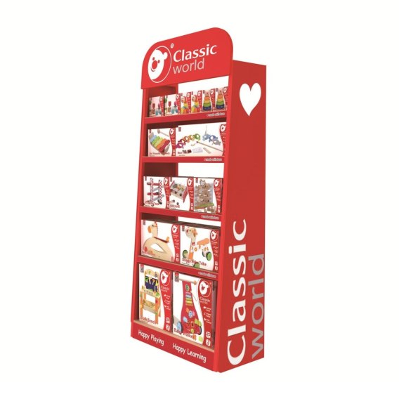Regał ekspozycyjny od marki Classic World to profesjonalny element wyposażenia, który doskonale sprawdzi się w każdym sklepie z zabawkami, przedszkolu lub sali zabaw. Ten imponujący drewniany stojak został zaprojektowany tak, aby przyciągać wzrok i zachęcać do interakcji z ułożonymi na nim produktami. Mebel charakteryzuje się żywą, czerwoną kolorystyką oraz estetycznym wykonaniem z dbałością o detale, takie jak wycięte serce na boku czy hasło "Happy Playing Happy Learning" na dole konstrukcji. Posiada aż 5 pojemnych półek, które pomieszczą szeroki asortyment zabawek, od puzzli po instrumenty muzyczne. Solidny topper z logo marki buduje rozpoznawalność i podkreśla wysoką jakość oferowanych produktów.