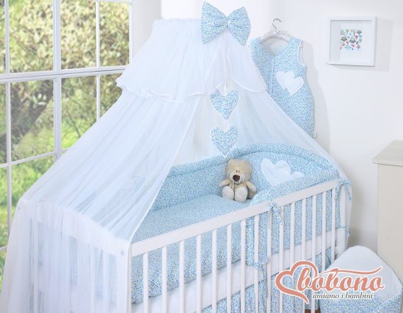 Duża moskitiera do łóżeczka dziecięcego z białego szyfonu z serduszkami i kokardką-łączka niebieska