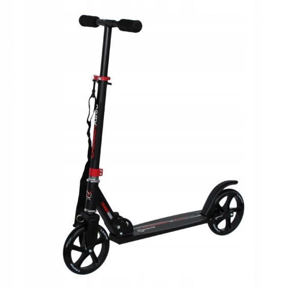 Lekka wzmacniana hulajnoga ze stopką i paskiem transportowym posiada regulowaną wysokość kierownicy. Hulajnoga jest składana, a więc wygodna w transporcie i zajmuje mało miejsca podczas przechowywania. Rączki kierownicy wykonane są z miękkiej pianki zapewniają dobrą chwytność, nie powodują obtarcia i pocenia rąk, co podnosi komfort i bezpieczeństwo jazdy. Tylni błotnik służy jako hamulec.