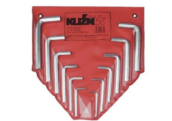 KOMPLET KLUCZY IMBUSOWYCH RWTg 12szt. KUŹNIA cynk ETUI Klucze imbusowe, trzpieniowe są jednym z podstawowych narzędzi używanych w profesjonalnych warsztatach. Przeznaczone do pracy pod zmiennymi obciążeniami. Wyprodukowane ze specjalnej odmiany stali chromowo-wanadowej. Właściwości stali chromowo-wanadowej są porównywalne ze stalą typu 8650. Dzięki ocynkowanej powłoce klucze zabezpieczone są przed korozją, utlenianiem oraz cechują się dużą wytrzymałością na czynniki zewnętrzne. Zestaw zawiera klucze o rozmiarach: 4-5-6-7-8-9-10-11-12-13-14-17. Waga całego kompletu około 1626g. Produkt zgodny z normą: PN-ISO 2936. Cechy produktu: wykonany ze stali chromowo-wanadowej powierzchnia ocynkowana wytrzymały, trwały, niezawodny produkt zgodny z normą: PN-ISO 2936 Producent: KUŹNIA Sułkowice S.A. Adres korespondencyjny: 1 Maja 70,Sułkowice Adres e-mail: sprzedaz@kuznia-sulkowice.pl