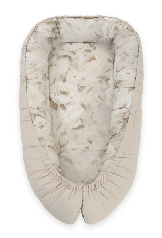 Kokon niemowlęcy dwustronny kojec otulacz Premium BOBONO- Peonies beige/ kamienna szarość