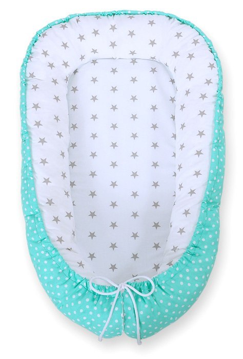 Kokon niemowlęcy dwustronny kojec otulacz Premium BOBONO- szare gwiazdki/ grochy na mięcie