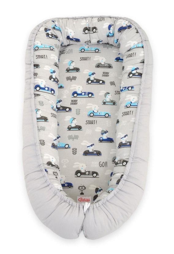 Kokon niemowlęcy dwustronny kojec otulacz Premium BOBONO- zające w autkach szare/ szary