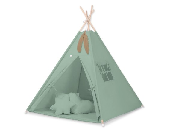 Namiot TIPI dla dzieci + mata + poduszki + zawieszki pióra - szałwia