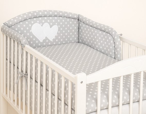 Ochraniacz do łóżeczka na szczebelki uniwersalny - Serduszka białe grochy na szarym