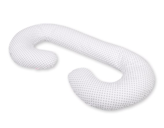 Duża, bardzo wygodna, poduszka ciążowa typu C ułatwia wygodne spanie na boku w czasie ciąży. Ergonomiczny kształt litery C to najczęściej wybierany model poduszki ciążowej. Poduszka w kształcie C pozwala każdej przyszłej mamie czuć się komfortowo podczas odpoczynku i snu, jak również w późniejszym czasie stanowi nieocenioną pomoc przy karmieniu niemowląt piersią oraz butelką.Poduszka ciążowa C idealnie sprawdza się podczas ciąży. Szczególnie w III trymestrze ciąży. Kiedy brzuszek staje się coraz większy i utrudnia wygodne ułożenie się podczas snu czy odpoczynku. Wyjątkowy kształt poduszki C pomaga przyjąć przyszłej mamie najbardziej wygodną pozycję podczas spania. Poduszka stanowi wsparcie całego ciała kobiet w ciąży, zwłaszcza odcinka lędźwiowego, kręgosłupa, brzucha, nóg oraz zapewnia odciążenie stawu biodrowego.