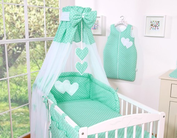 Pościel 5-cz 120x90 - Serduszka białe grochy na mięcie