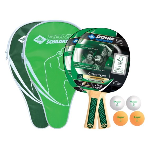 W zestawie znajdują się 2 osobne pokrowce na rakietki - dzięki czemu rakietki są zabezpieczone. Są one chronione przed uszkodzeniami i zabrudzeniami. W zestawie znajdują się również 4 piłeczki do tenisa stołowego jakości Donic-Schildkröt, 40 mm, w nowej jakości poly (2 białe, 2 pomarańczowe) - bez celuloidu. Kompletny zestaw zapakowany jest w blister, dzięki czemu wszystko dociera do nas nieuszkodzone. Champs Line wykorzystuje teraz także przyjazne środowisku, certyfikowane drewno organizacji FSC (Forest Stewardship Council).