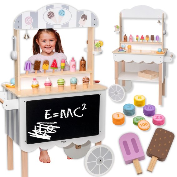 Sklep, Cukiernia, Lodziarnia 3w1 jest doskonałym prezentem dla małych cukierników. Zestaw jest idealny dla dziecka, które chce wcielić się w rolęsprzedawcy czy cukiernika. Dzięki tej zabawce dziecko poczuje się jak profesjonalny sprzedawcasłodkości. Zabawka posiada wiele drobniejszych akcesoriów takich jak lizaki, lody, wafelki czy polewy. Dodatkowo sklep posiada tablicę, na której dziecko może malować czy pisać ceny lub dzisiejsze menu. W sklepie znajduje się półeczka, na której można chować różne rzeczy. Całość pomalowana jest nietoksycznymi farbami w łagodnej kolorystyce przyciągającej uwagę dziecka.